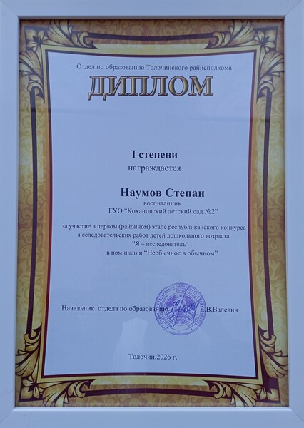 Диплом первой степени, поздравления и подарки были вручены Степану методистом Государственного учреждения «Толочинский районный учебно-методический кабинет» Костюкевич Юлией Михайловной, представителем Толочинской районной организации РОО "Белая Русь", методистом Государственного учреждения «Толочинский районный учебно-методический кабинет» Кравченко Аллой Михайловной, руководителем Толочинской районной организации Белорусского профсоюза работников образования и науки, методистом Государственного учреждения «Толочинский районный учебно-методический кабинет» Щаврук Еленой Викторовной, в присутствии заместителя заведующего по основной деятельности Воропаевой Натальи Викторовны и руководителя исследовательской работы, воспитателя дошкольного образования второй квалификационной категории Рощиной Кристины Игоревны.
