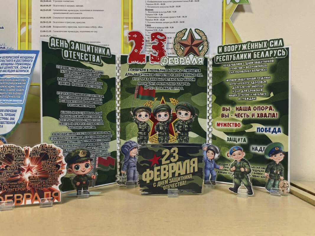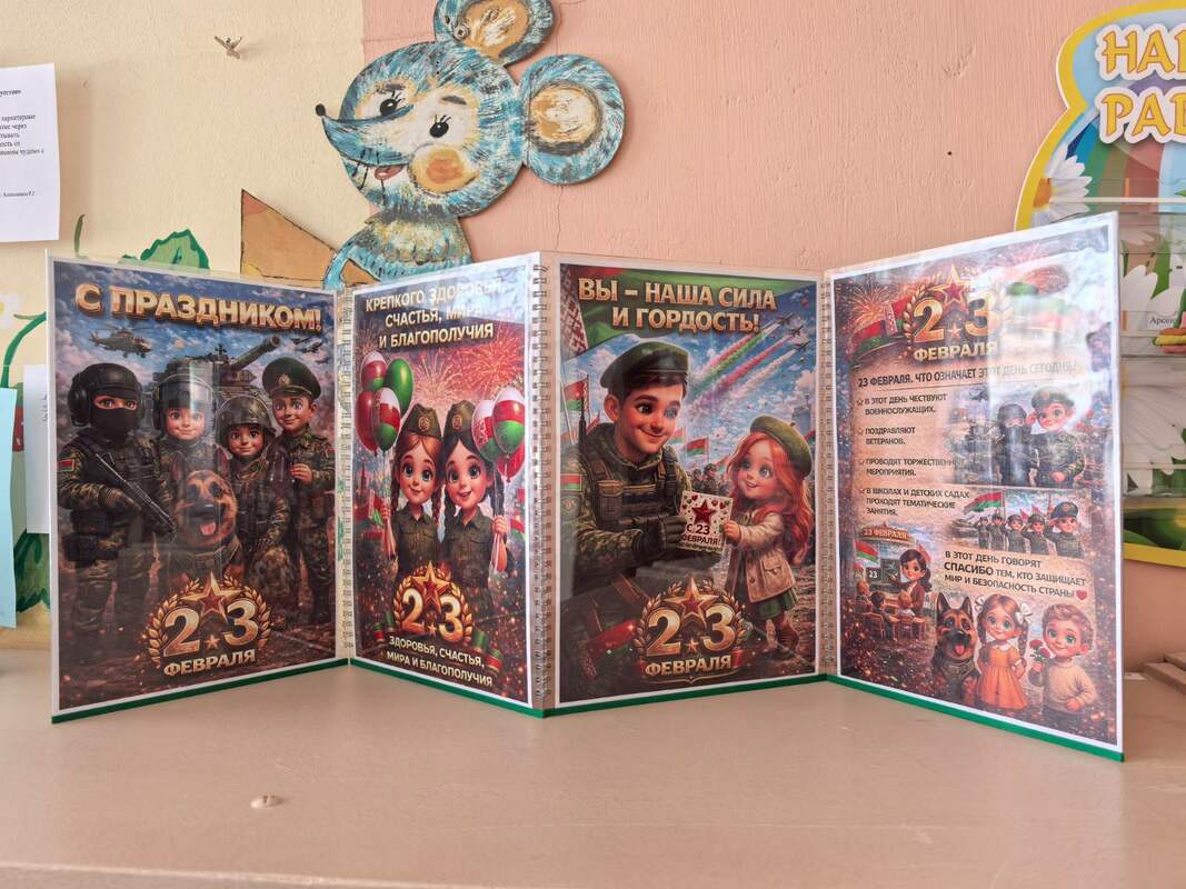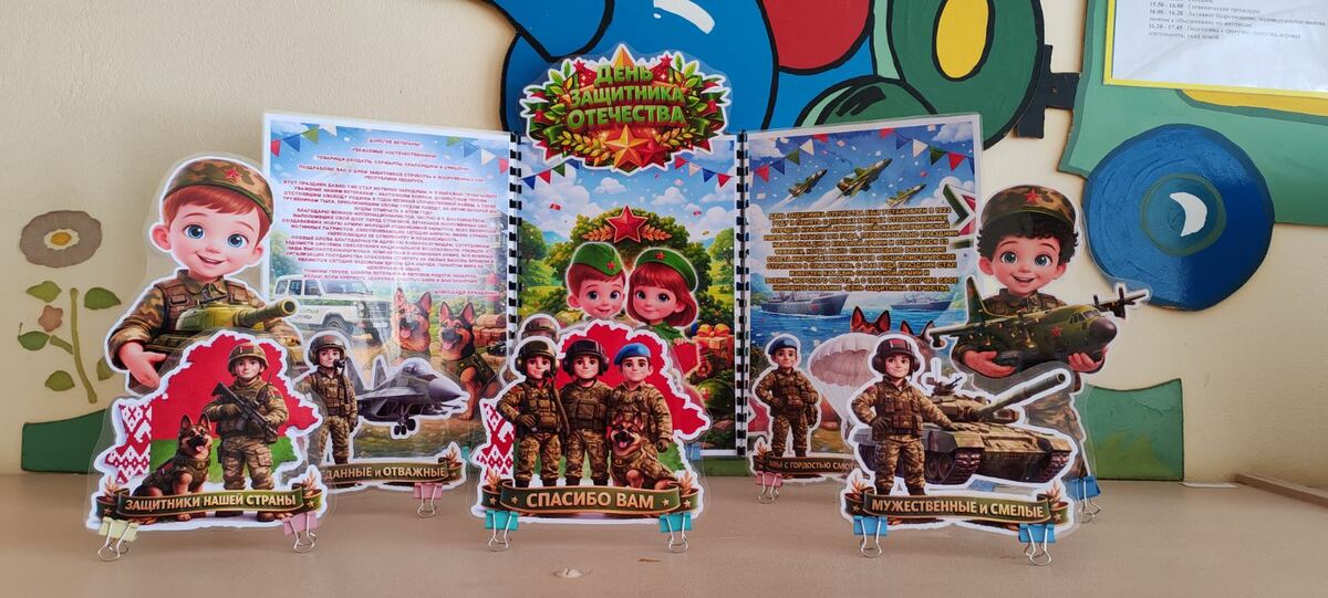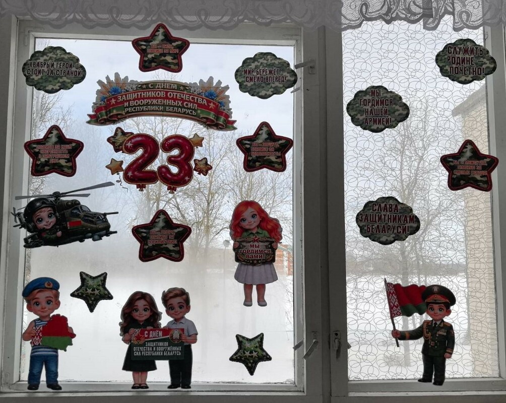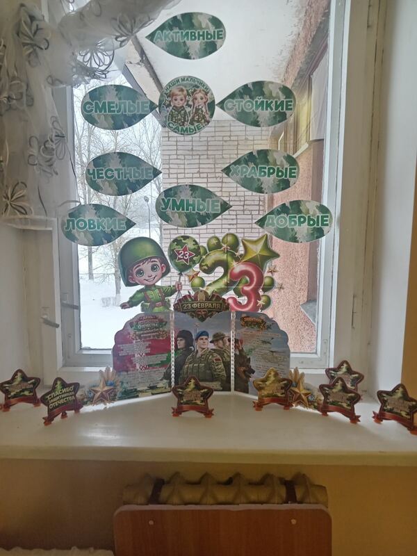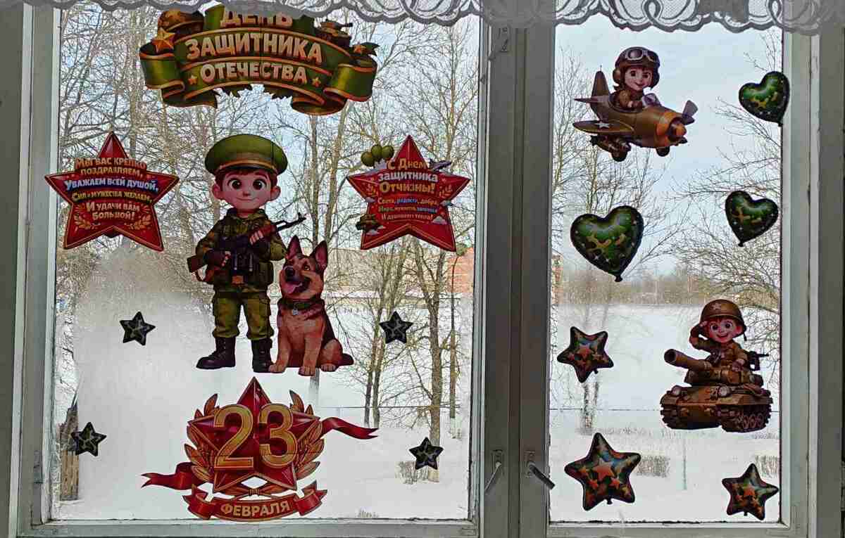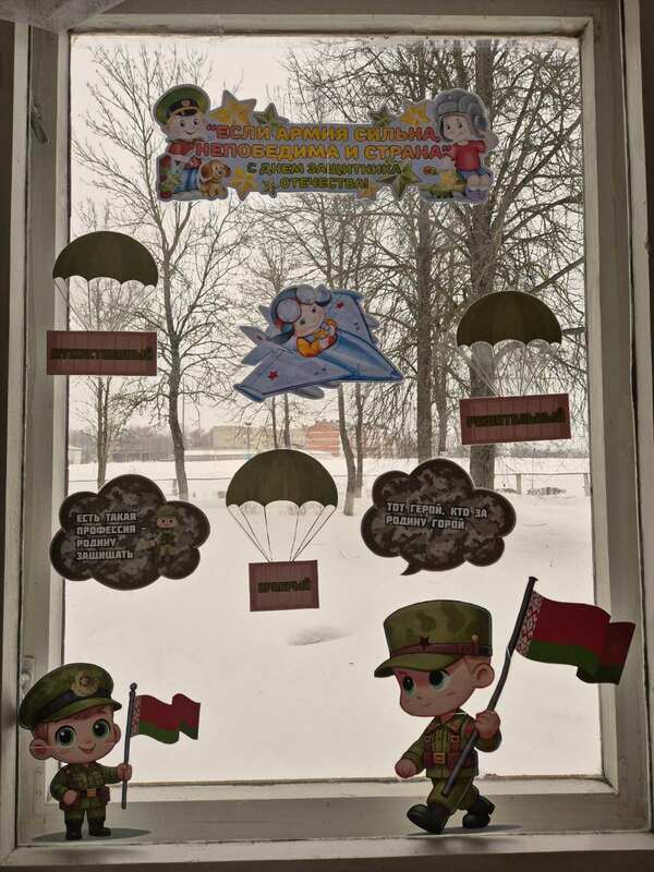 Во всех группах педагоги провели с детьми беседы, тематические занятия, читали рассказы об армии, оформили яркие панорамы для родителей и украсили окна. Воспитанники подробно узнали о том, кто такие защитники Отечества, о разных родах войск, о военных профессиях.